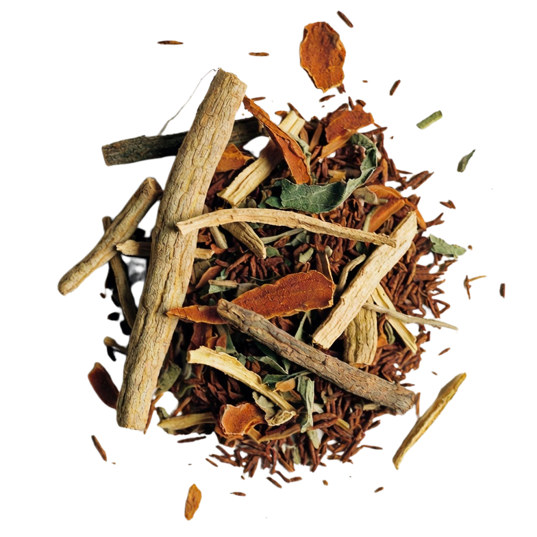 Smooth rooibos leaves contribute a nutty, vanilla-like sweetness, hailing from South African sun-drenched fields.